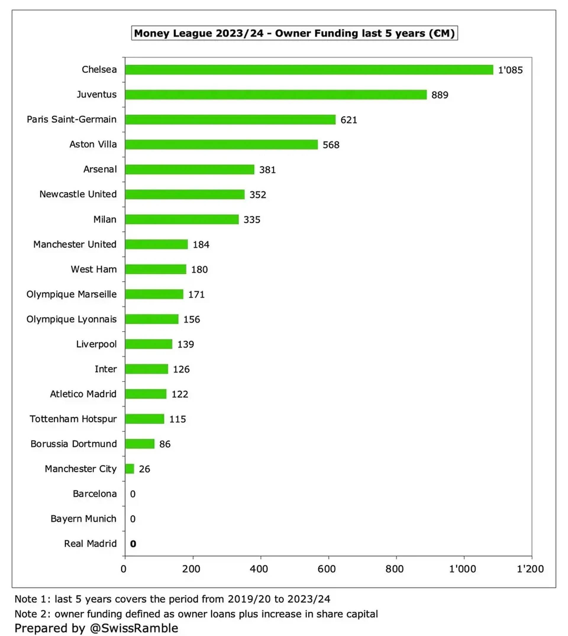 Самым неожиданным фактом исследования стало то, что такие гранды, как «Барселона», «Бавария» и мадридский «Реал», за указанный период не получили ни одного евро в виде прямого финансирования от владельцев, существуя исключительно на заработанные средства и кредитные линии.