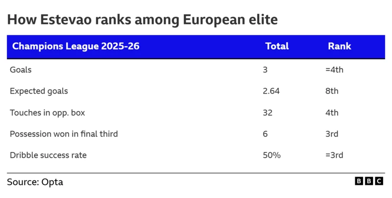 Согласно статистике Opta, Эстевао уже сравнивается с европейской элитой в Лиге чемпионов 2025-26 по ряду ключевых показателей.