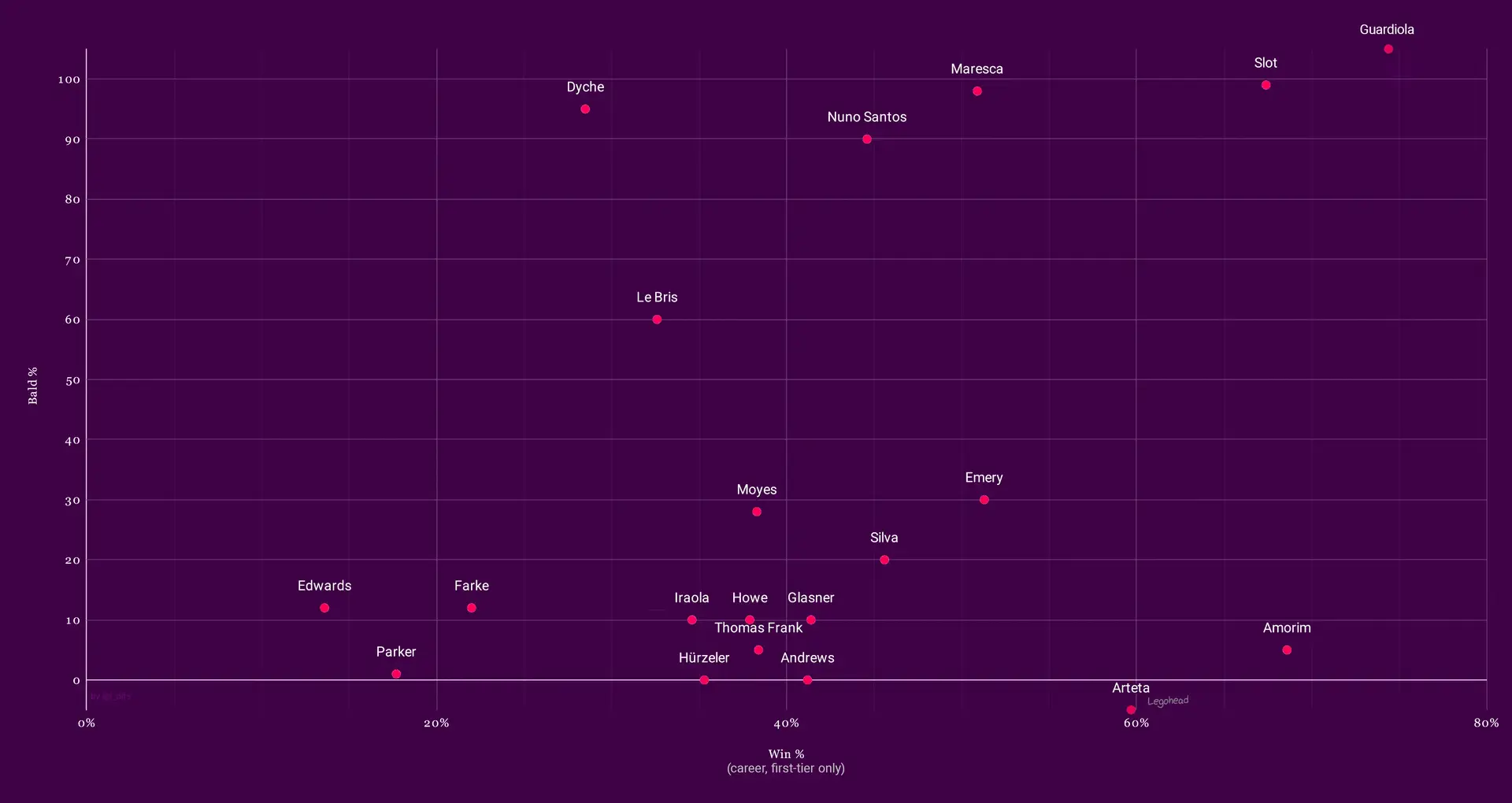 Интересно, что их главные оппоненты с пышной шевелюрой показывают сопоставимые, но не всегда превосходящие результаты. Например, Микель Артета, чей уровень облысения оценивается как «отрицательный» (менее 0%), имеет процент побед около 60%. Новый наставник «Манчестер Юнайтед» Рубен Аморим демонстрирует еще более высокую эффективность — порядка 65%, оставаясь при этом в «волосатом» лагере.