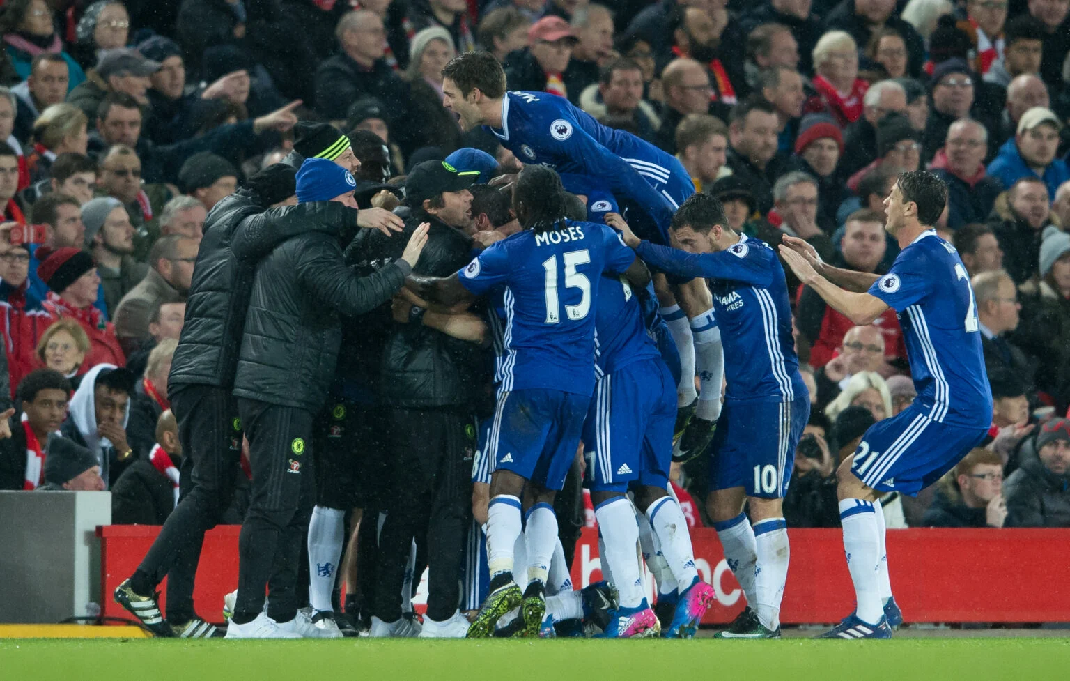 В сезоне 2016/17 подопечные Антонио Конте уверенно шли к чемпионству. На 24-й минуте матча против «Ливерпуля» Давид Луиз решился на дерзкий удар с дальней дистанции, пока вратарь хозяев Симон Миньоле выстраивал стенку. Мяч рикошетом от штанги влетел в сетку, став настоящим украшением того сезона. Несмотря на то что встреча завершилась вничью 1:1, этот набранный балл помог «синим» закрепить лидерство и в конечном итоге выиграть титул Премьер-лиги с отрывом в семь очков от преследователей.