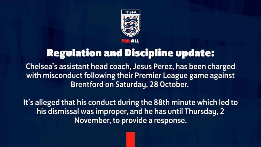 Ассистенту главного тренера «Челси» Маурисио Почеттино, Хесусу Пересу, были предъявлены серьезные обвинения в ненадлежащем поведении после матча против команды «Брентфорд».