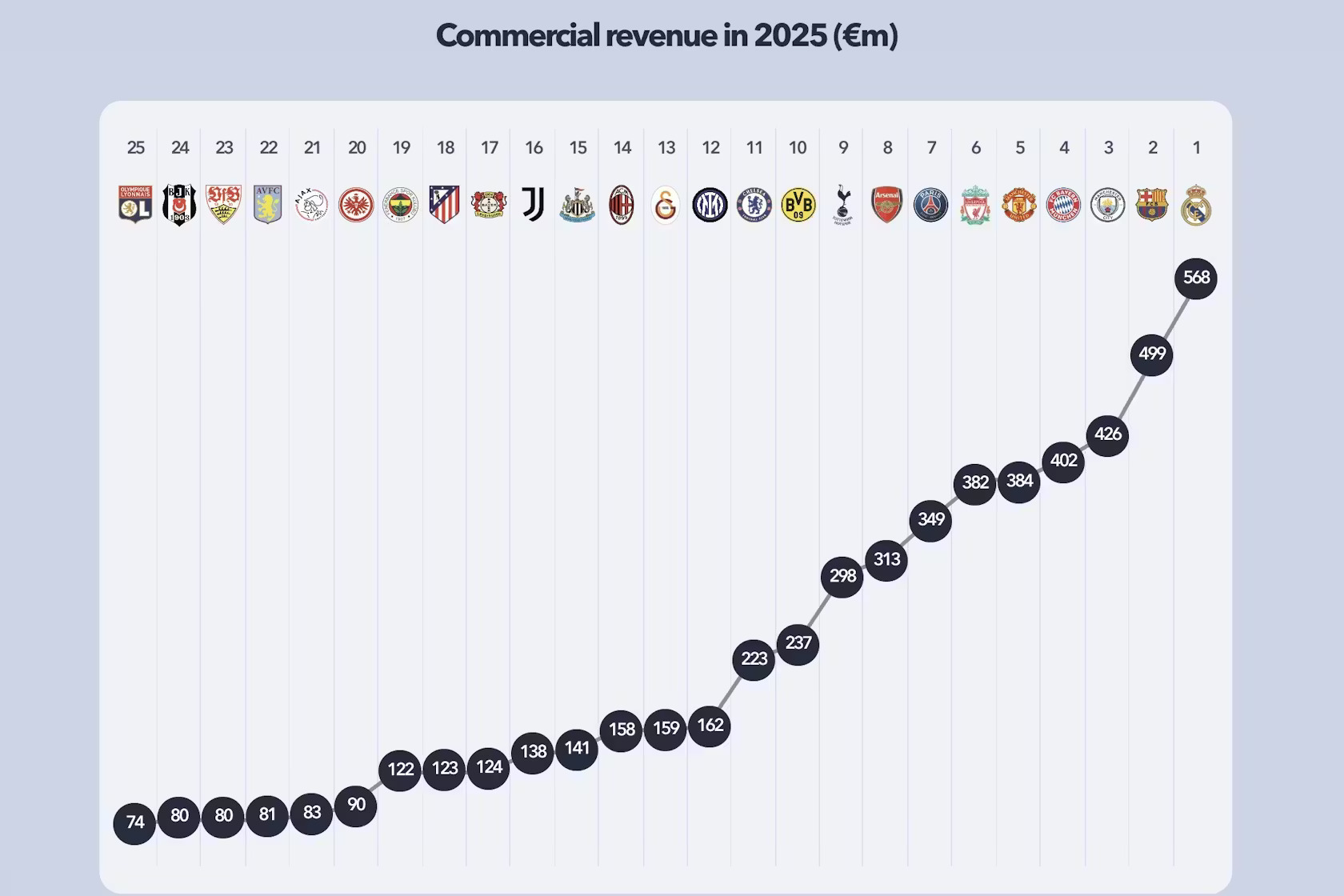 «Реал Мадрид» и «Барселона» продолжают доминировать в Европе, когда речь заходит о коммерческих доходах и мерчандайзинге. Несмотря на то, что дуэт участников «Эль-Класико» может быть обеспокоен стремительным ростом доходов Премьер-лиги от продажи прав на телетрансляции, в других сферах развития они остаются «альфа-самцами». Единственным другим представителем Испании, попавшим в топ-25 по обоим показателям, стал «Атлетико Мадрид».